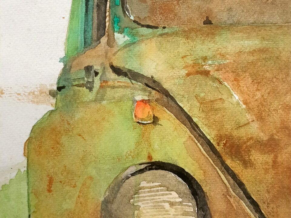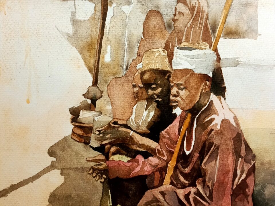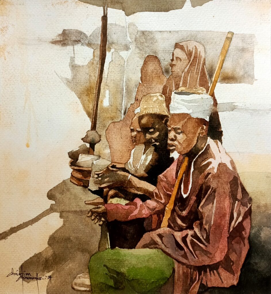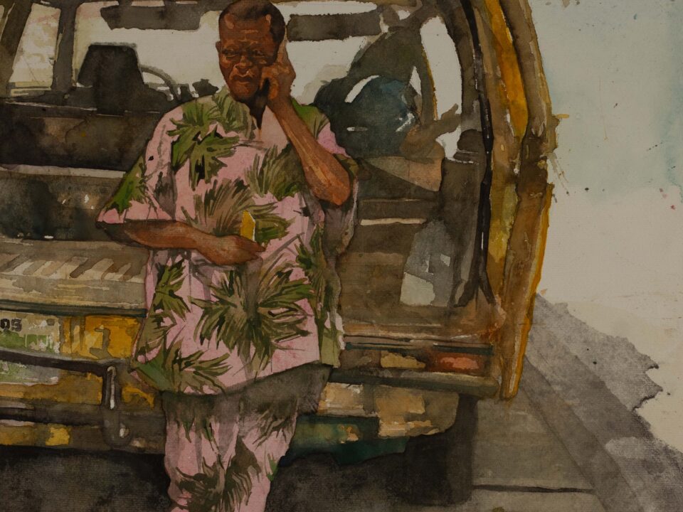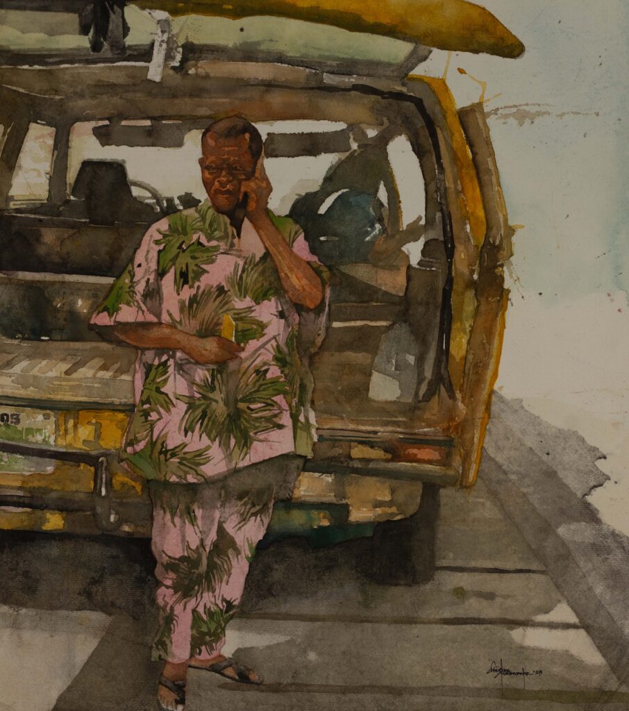 Rendered in watercolour — a medium as fluid and unpredictable as the city it portrays — each piece invites viewers to engage with movement not just as physical transit, but as emotional and generational passage. In doing so, Chrome & Dust becomes a mirror to Lagos itself: complex, moving, and deeply human.