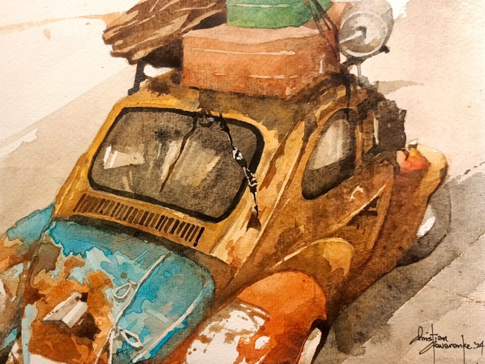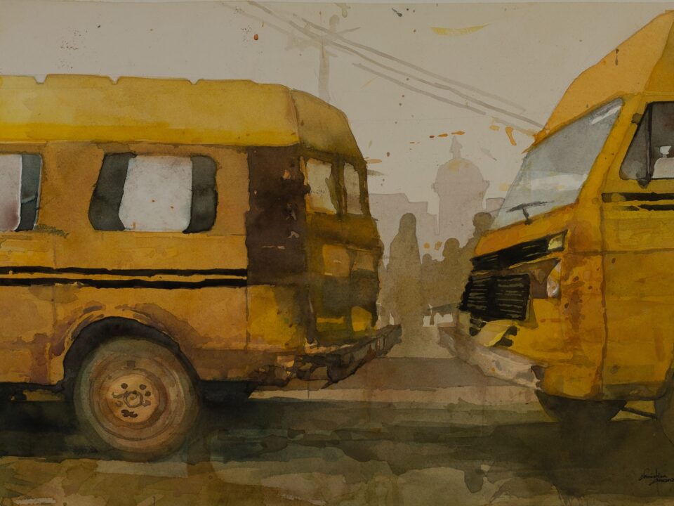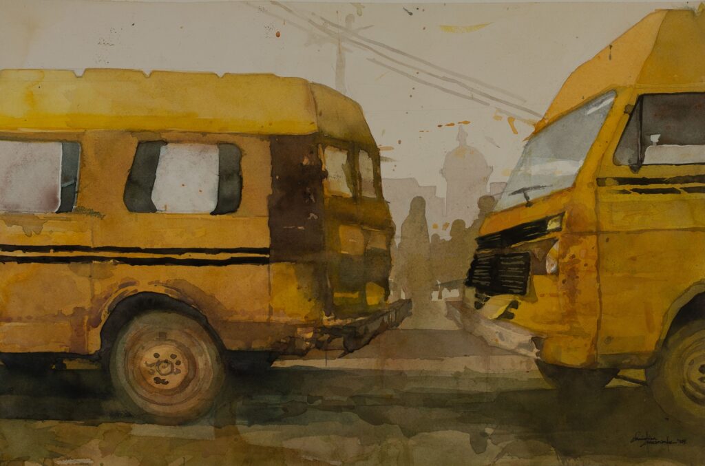 Set against the textured, ever-changing backdrop of Lagos, this exhibition frames the city’s iconic vehicles — the danfo, keke, and korope — not as symbols of dysfunction, but as visual metaphors of resilience, adaptation, and lived history. Okwananke’s watercolours capture the overlooked poetry of public transport: the torn upholstery, the faded religious decals, the moments of chaos that blur into routine.